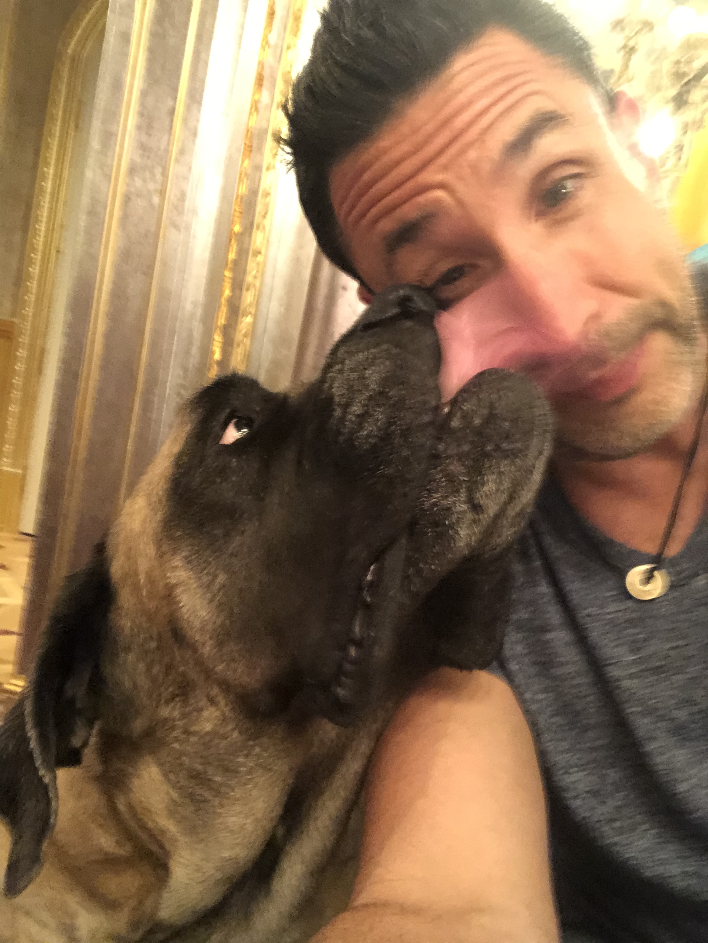 A man and a dog. He’s a licker!
