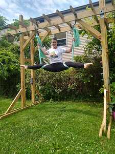 I took an aerial yoga class this morning. Learned this straddle pose! Practicing aerial yoga keeps my workouts fun. Would you try aerial?!